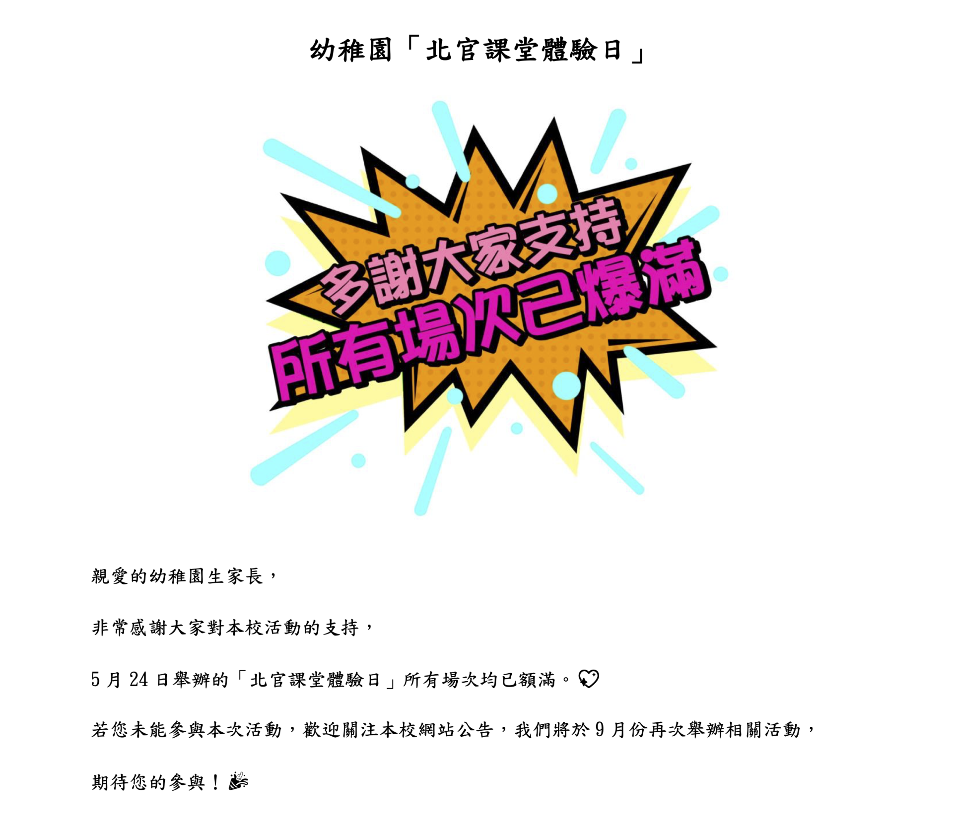 幼稚園「北官課堂體驗日」_多謝支持 所有場次已爆滿