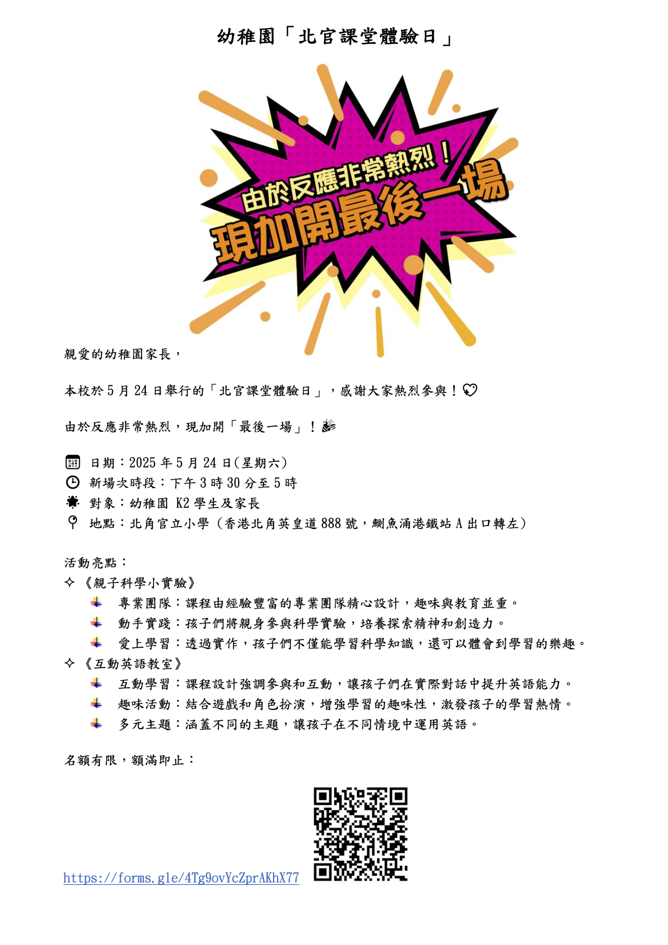 誠邀出席幼稚園「北官課堂體驗日」_現加開「最後一場」!