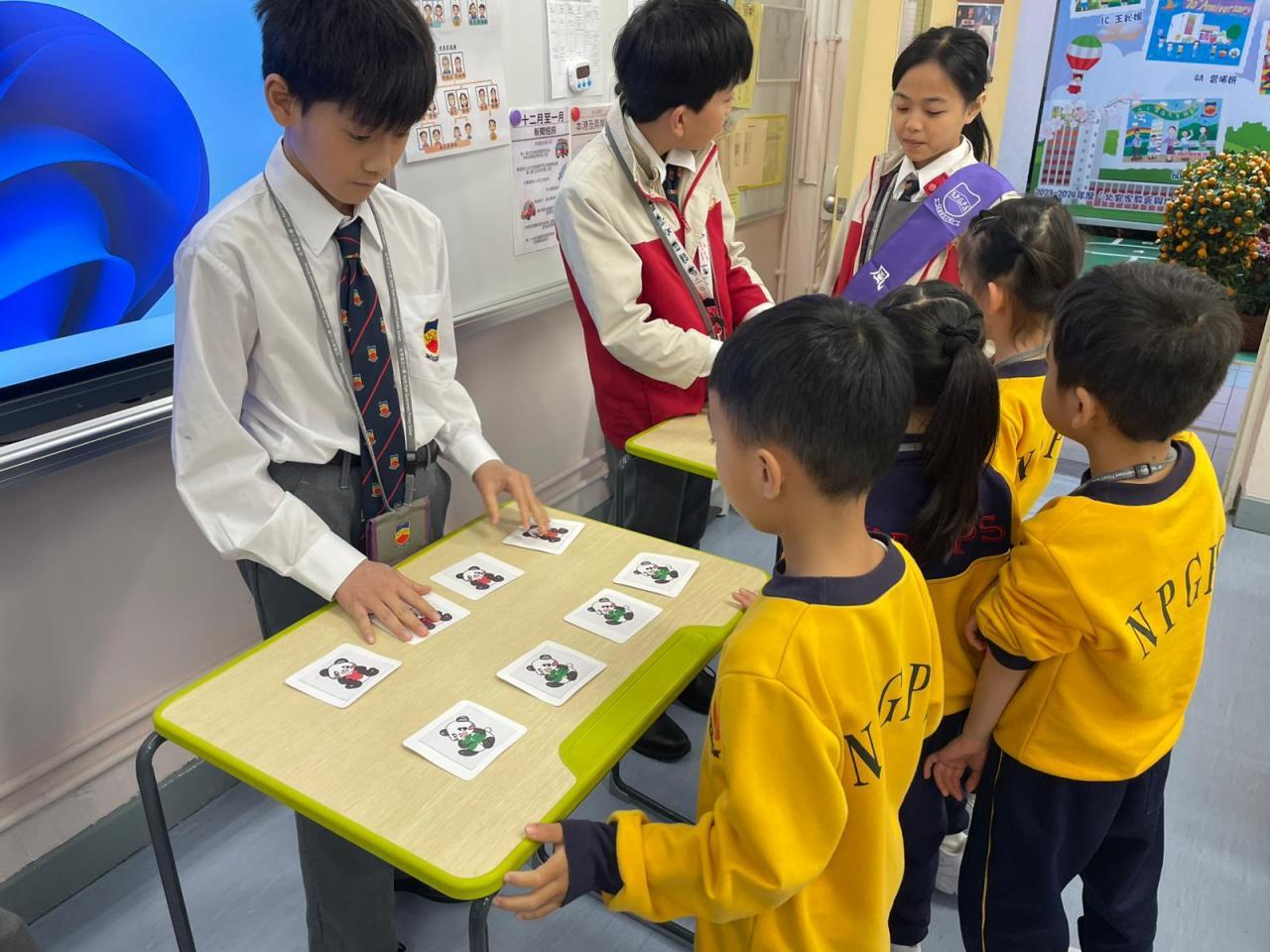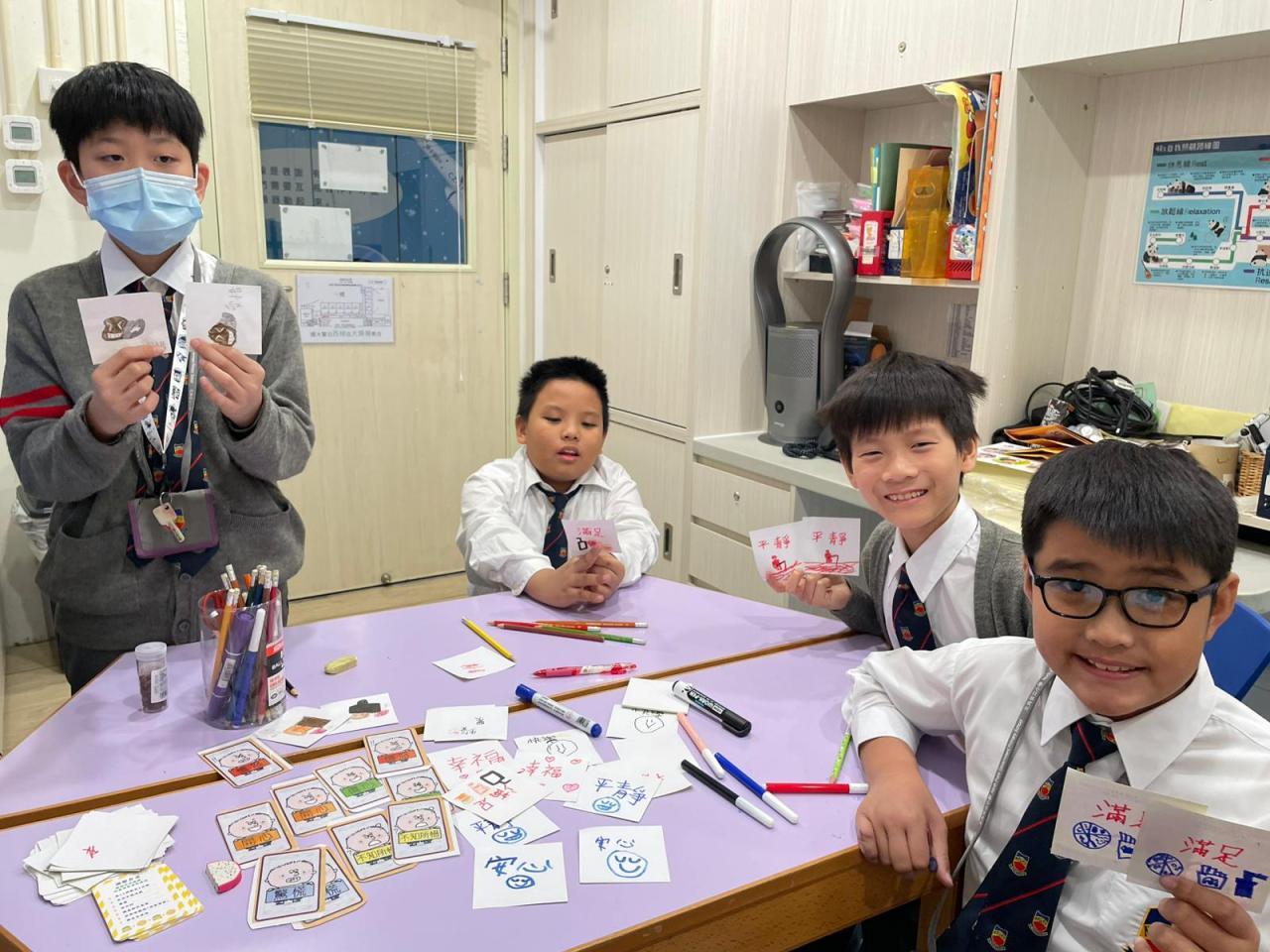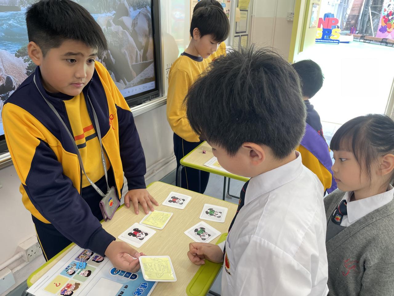 學校社工邀請高小學生擔任「情緒健康活動推廣大使」,由高小學生發揮創意設計遊戲卡,帶領低年級學生玩情緒配對卡遊戲。從中教育教育同學以正向的方式舒緩壓力和情緒。