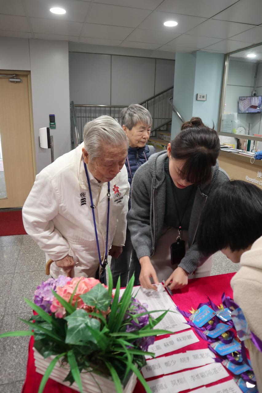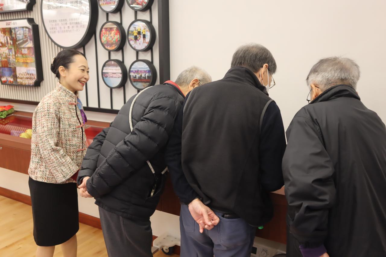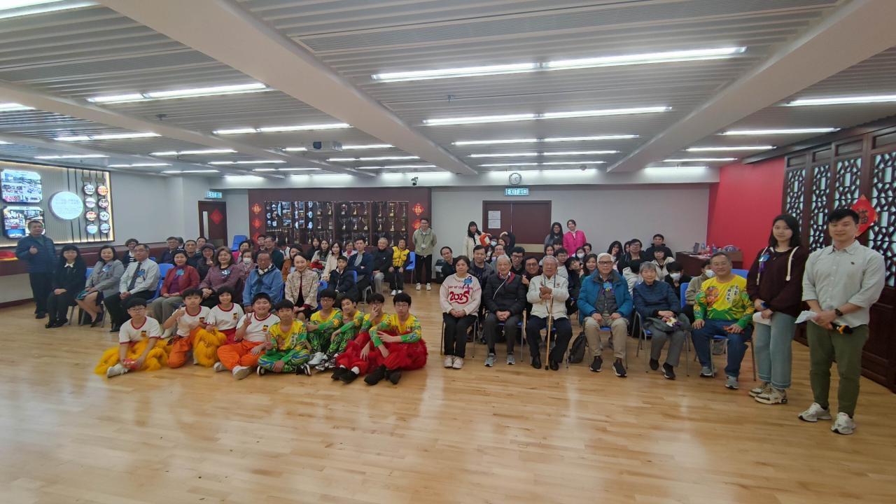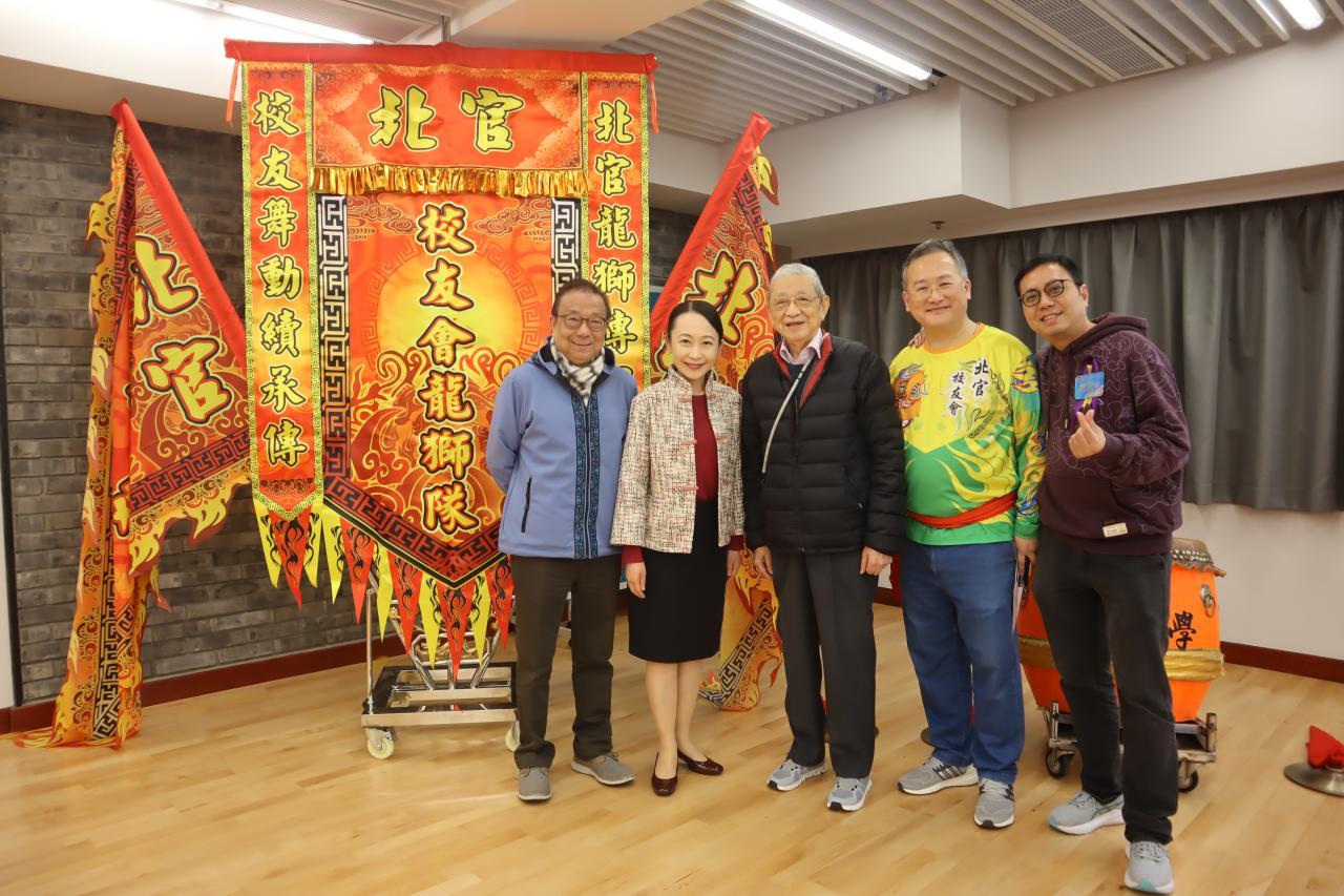 新春團拜活動由北官醒獅隊揭開序幕,首先進行的是「簪花、掛紅及點睛儀式」。葉韻婷校長、學校管理委員李復翰先生,以及前任校長鄧敏宜校長和鄧愛蓮校長,共同為校友醒獅隊簪花掛紅。隨後,陸顏娟主席和廖卓新副主席陪同三位創校老師李錫瑜老師、尹慶源老師及伍啟基老師為北官的醒獅隊點睛,祝願母校校運昌隆,學弟學妹們龍精虎猛。