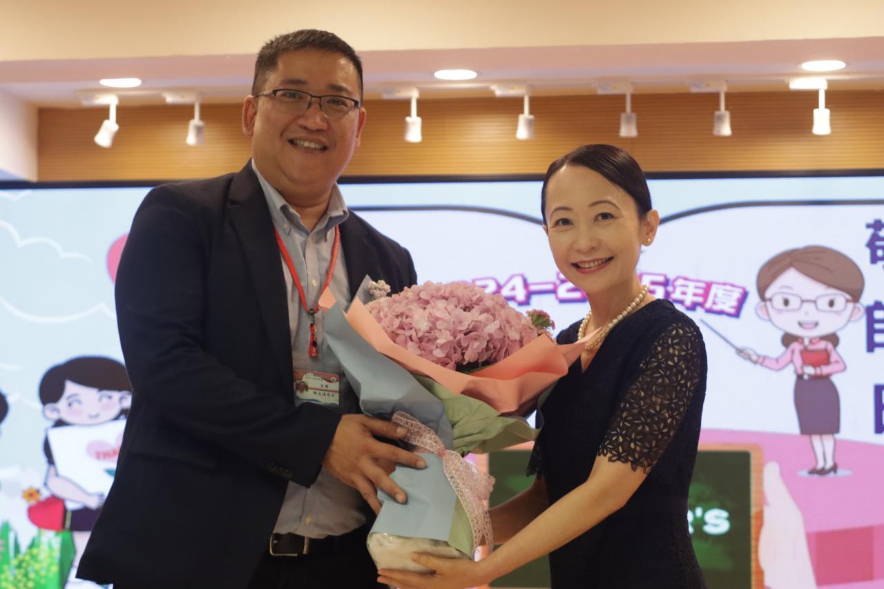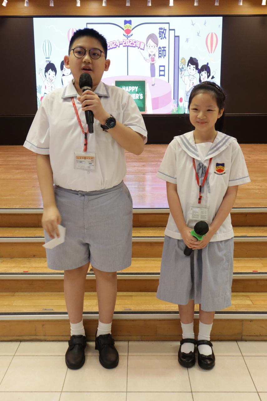 隨後,學生代表分別以中文及英文向老師致謝辭。接著,家長教師會的委員和學生代表向葉校長及各位老師獻上花束,以表達他們的謝意,場面既溫馨又感人。在此,我們特別感謝當天出席的家長教師會委員,他們以身作則,支持「家長也敬師」的活動。